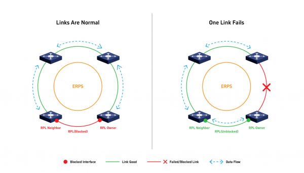 El principio de funcionamiento de ERPS consiste en designar un switch como propietario del Enlace de Protección del Anillo (RPL). En condiciones normales, el propietario del RPL bloquea un enlace del anillo para evitar bucles de red. El protocolo intercambia continuamente mensajes de control (tramas R-APS) entre todos los nodos del anillo para monitorear el estado de los enlaces. Ante una falla, los nodos afectados notifican inmediatamente al propietario del RPL, quien desbloquea el enlace previamente bloqueado, permitiendo la redirección del tráfico por el camino de respaldo.