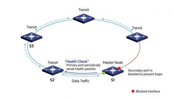 • El nodo maestro envía periódicamente paquetes de integridad para supervisar la integridad del anillo. El puerto secundario permanece bloqueado normalmente para evitar bucles.