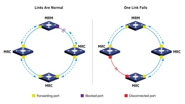 En un anillo MRP, un dispositivo se designa como Gestor de Redundancia de Medios (MRM), mientras que los demás funcionan como Clientes de Redundancia de Medios (MRC). El MRM supervisa continuamente el estado del anillo y bloquea habitualmente uno de sus puertos para evitar bucles en la red. Ante una falla en un enlace o dispositivo, el MRM desbloquea de inmediato dicho puerto, permitiendo que el tráfico se desvíe por la ruta alternativa.