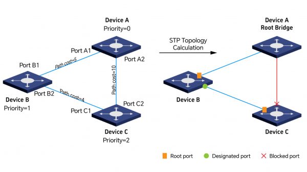 • Bloqueo de puertos redundantes: Se colocan en estado de bloqueo todos los puertos que podrían generar bucles, impidiendo la transmisión de datos pero manteniendo la supervisión de BPDUs.